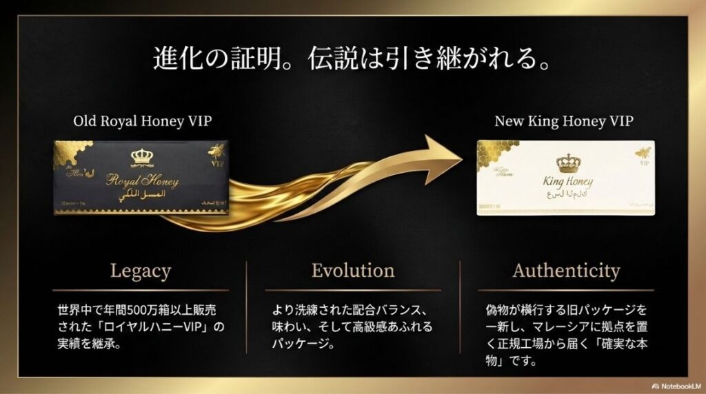 1. 旧ロイヤルハニーは販売休止!現在は「キングハニーVIP」へ進化 長年愛されてきた旧「ロイヤルハニー」「ロイヤルハニーVIP」は2025年夏に販売を休止しました。現在、当サイト「ロイヤルハニーオフィシャル」では、その成分と安全性をさらに極めた男性向け進化版ブランド「キングハニーVIP」、そして女性・カップル向けの「ロイヤルハニーVIPプレミアム」として新たなステージへと突入しています。