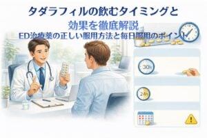 ED治療薬は、性行為の約1時間前に服用するのが適切とされています。バイアグラやレビトラなどの薬剤は、食事の影響を受けやすいため、食前または食後2時間以上空けて水またはぬるま湯で服用するのが理想的です。シアリスは比較的食事の影響を受けにくいですが、やはり空腹時の方が吸収が良い傾向があります。
