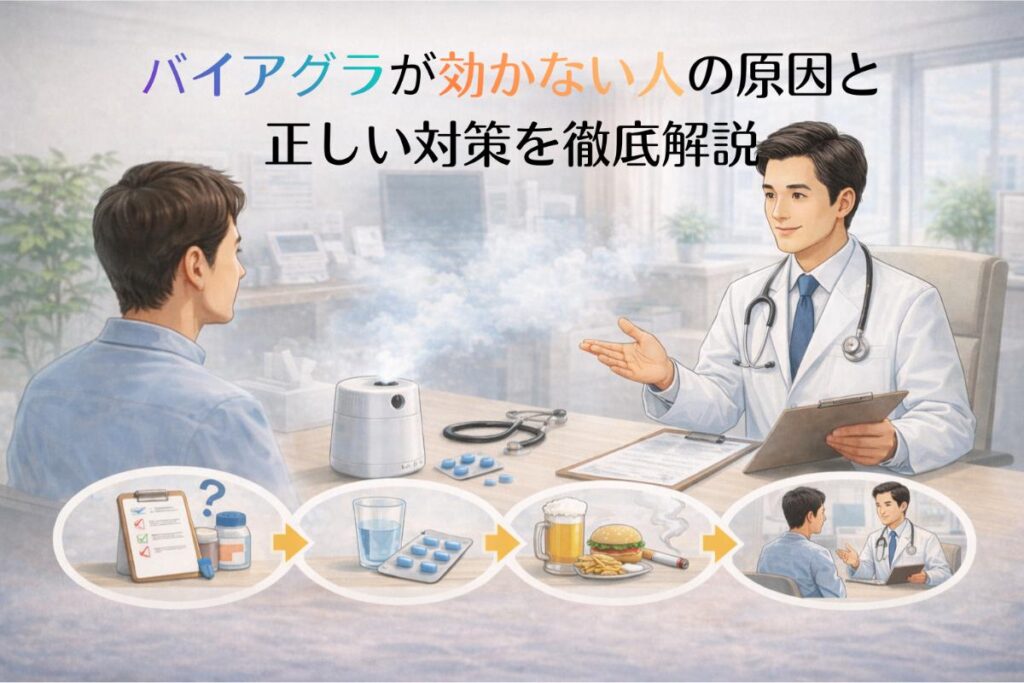バイアグラが「効かない」と感じる場合、その原因は一つではなく、複数の要因が重なっていることが多くあります。まず代表的なのが服用方法の誤りです。バイアグラは空腹時に服用することで吸収が良くなりますが、脂っこい食事の直後に飲むと効果が弱まることがあります。また、バイアグラは性的刺激があって初めて作用する薬であり、飲んだだけで自然に勃起するものではありません。次に体質や加齢の影響も重要です。血管の老化や血流障害が進行している場合、薬の効果が十分に発揮されにくくなります。糖尿病、高血圧、脂質異常症などの基礎疾患がある方も、効果を実感しにくい傾向があります。さらに、強い緊張や不安、プレッシャーといった心理的要因が勃起を妨げるケースも少なくありません。加えて、喫煙や過度な飲酒、睡眠不足といった生活習慣の乱れも影響します。これらの原因を正しく理解し、医師と相談しながら用量調整や薬の変更、生活改善を行うことで、改善の可能性は十分にあります。