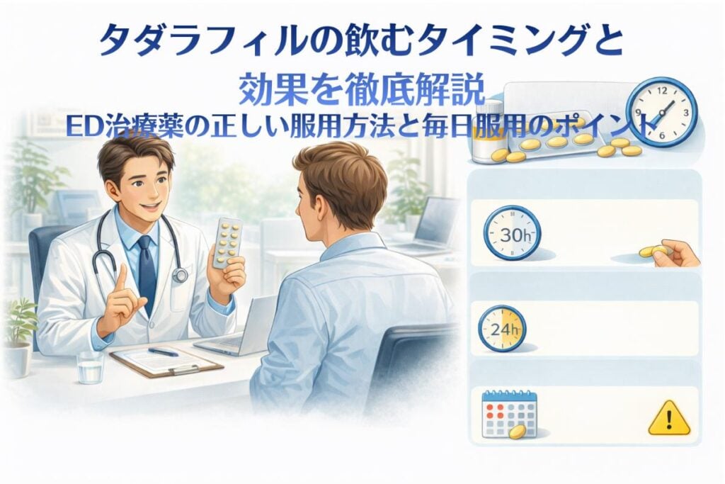 タダラフィルを飲むタイミングで迷っていませんか?“どのくらい前に服用すれば最大限の効果を得られるのか”“毎日飲む場合は何時がベストなのか”といった疑問や、「食事や飲酒が効果に影響しないか心配…」と感じている方も多いはずです。